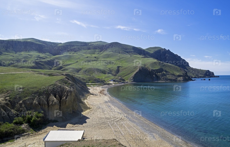 Спокойное море и пустой песчаный пляж в Капсельской бухте у подножья мыса Меганом. Не сезон. Крым, конец апреля