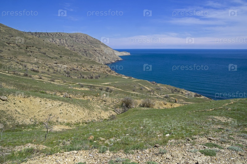 Небольшая безлюдная бухта на южной оконечности мыса Меганом. Крым. Солнечный день в конце апреля