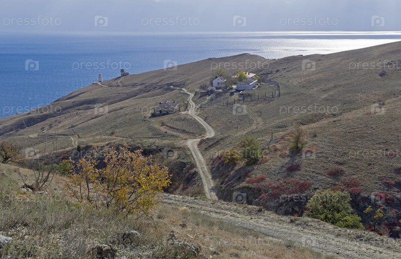 Дорога к маяку. Мыс Меганом, Крым. Солнечный день в середине октября