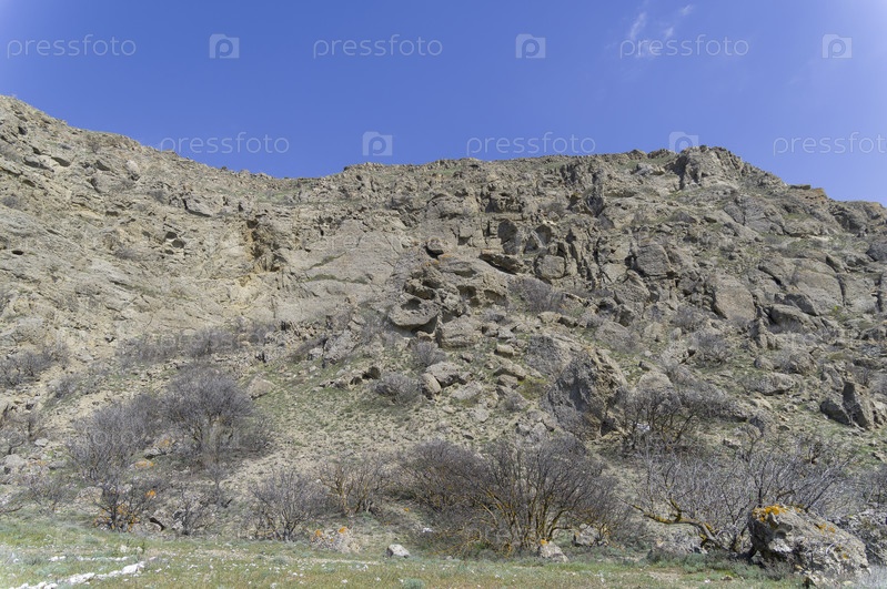 Скальный обрыв, в структуре которого видны следы окаменевших коралловых отложений. Мыс Меганом, Крым