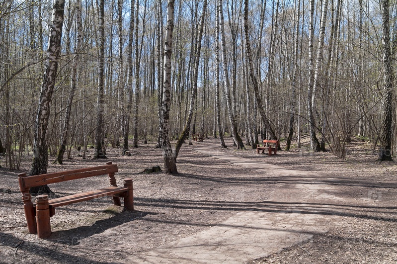 Пустая дорожка в весеннем лесу. Солнечный день в конце апреля. Теплостановский лесопарк, Москва