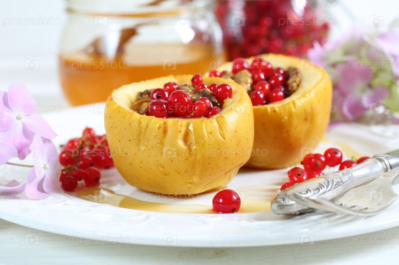 Печеные яблоки с медом, грецкими орехами, смородиной на белом фоне