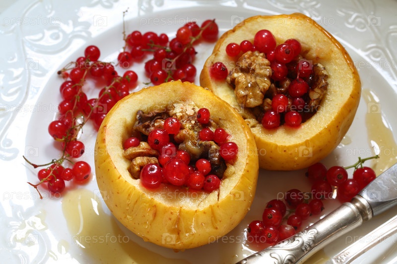 Печеные яблоки с медом, грецкими орехами, смородиной на белом фоне