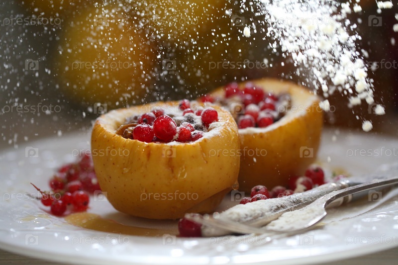 Печеные яблоки с медом, грецкими орехами, смородиной на белом фоне