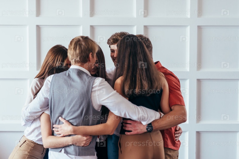 Психологическая поддержка, люди стоят в кругу и обнимаются