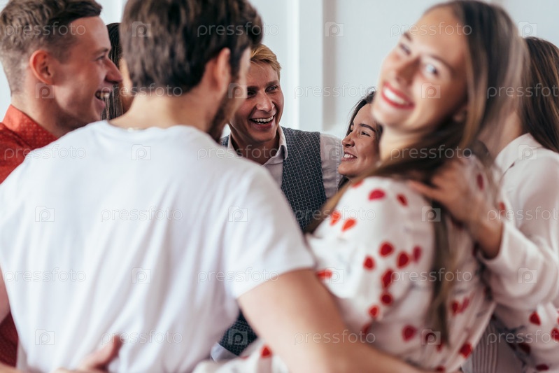 Группа обнимающихся людей, весело проводящих время вместе