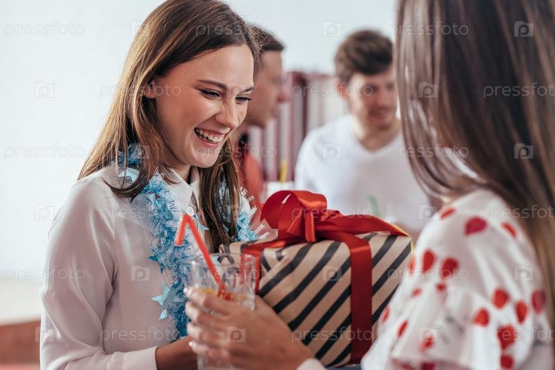 Девушка дарит подарок своей подруге во время новогодней вечеринки