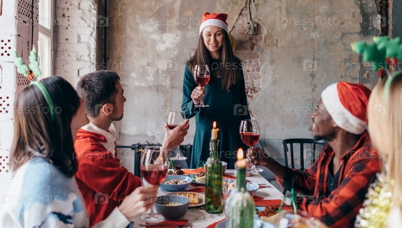 Молодая женщина стоит со стаканом и произносит тост, пока друзья сидят за праздничным столом