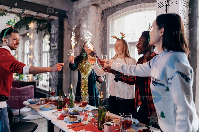 Группа людей, празднующих Рождество или Новый год. Друзья пьют напитки и наслаждаются ужином вместе