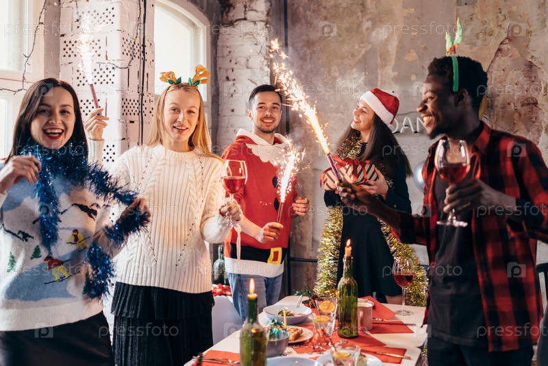 Группа друзей произносит тост с напитками на вечеринке в канун Рождества