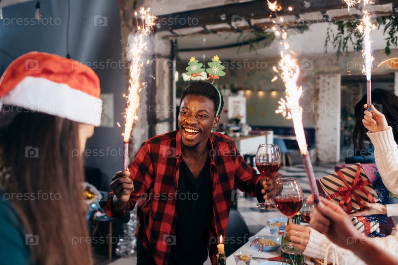 Люди пьют шампанское, празднуют с бенгальскими огнями и смотрят друг на друга, улыбаясь