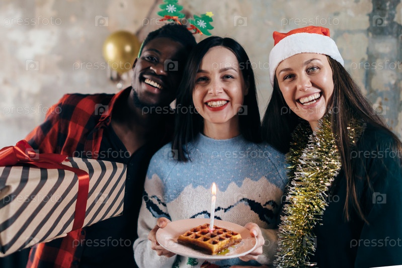 Женщина держит праздничный торт, готовится задуть свечу, друзья целуются в щеки