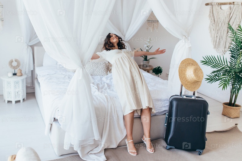 Женщина, приехавшая в отпуск, упала на кровать после заселения в отель