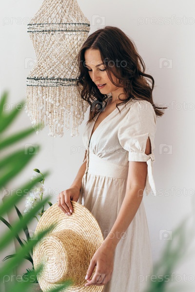 Летний портрет молодой женщины с соломенной шляпой в руке дома