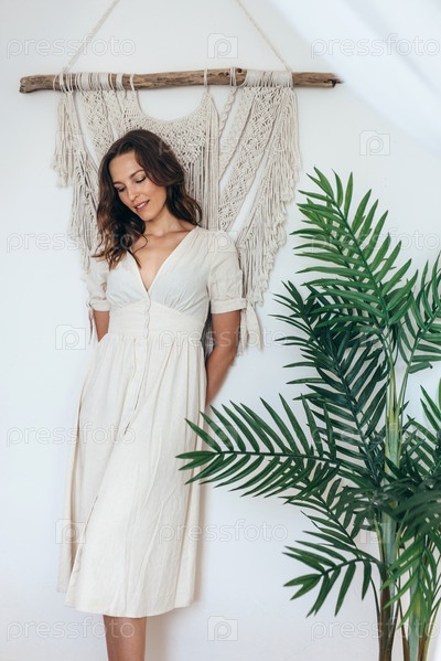 Портрет молодой женщины, стоящей в спальне