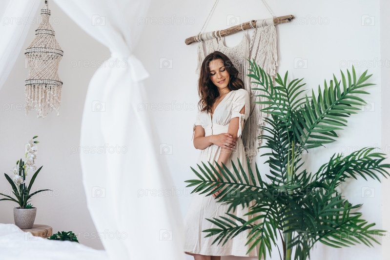 Портрет молодой женщины, стоящей в спальне