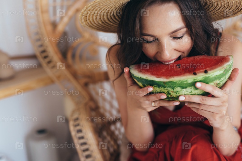 Молодая женщина ест большой кусок арбуза