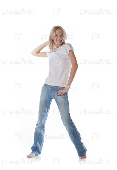 Симпатичная блондинка танцует на белом фоне
