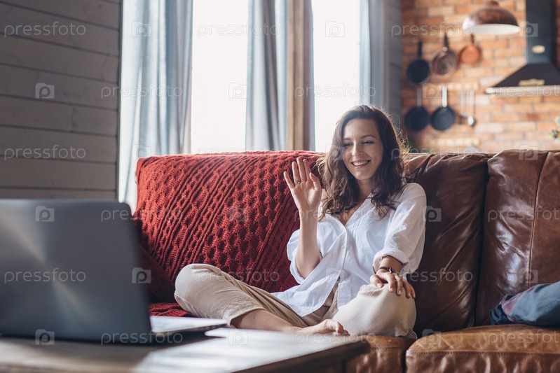 Женщина дома машет рукой, делая видеозвонок на ноутбуке