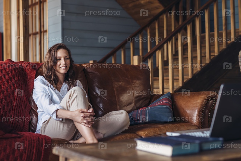 Молодая женщина сидит дома на диване и смотрит на экран своего ноутбука
