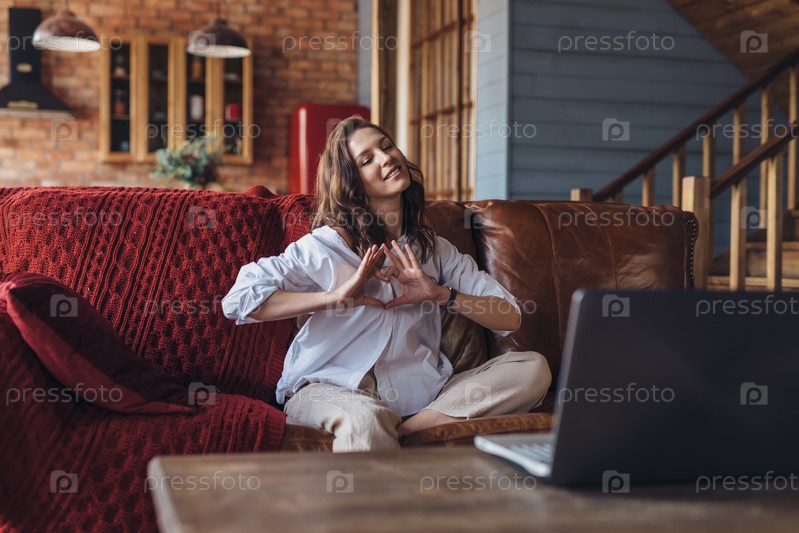 Женщина дома разговаривает с любимым человеком по видеосвязи и показывает жест сердца как символ любви
