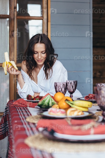 Молодая женщина за кухонным столом ест фрукты