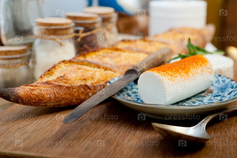 Французский сыр и свежий багет на резце по дереву