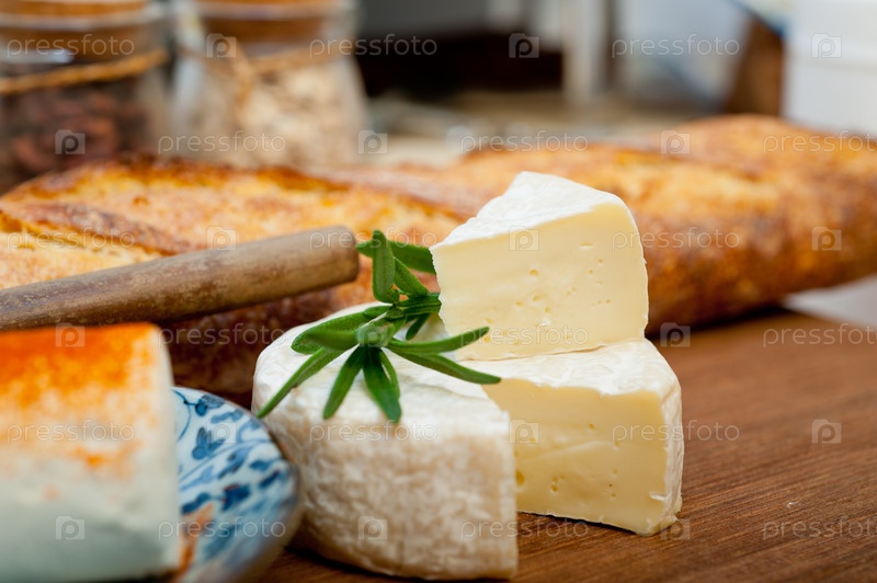 Французский сыр и свежий багет на резце по дереву