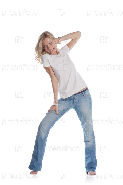 Симпатичная блондинка танцует на белом фоне