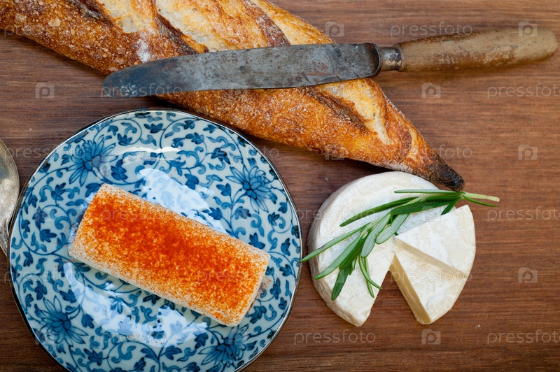 Французский сыр и свежий багет на резце по дереву