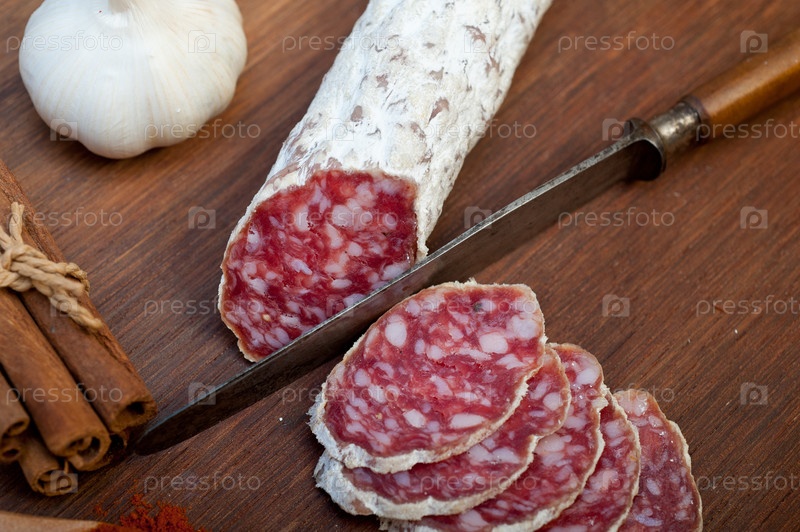Традиционная итальянская вяленая колбаса салями, нарезанная на деревянной доске