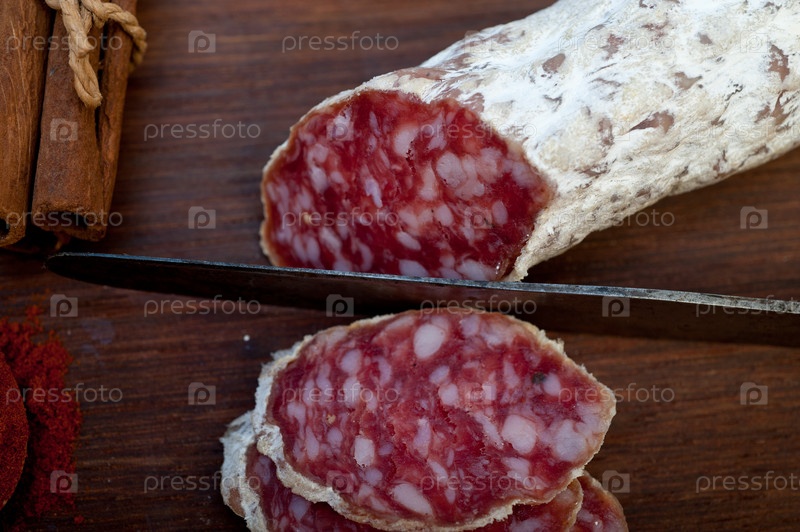 Традиционная итальянская вяленая колбаса салями, нарезанная на деревянной доске