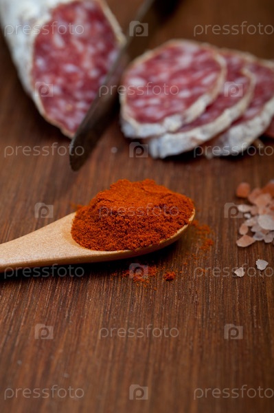 Традиционная итальянская вяленая колбаса салями, нарезанная на деревянной доске