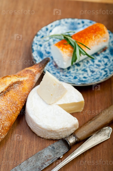 Французский сыр и свежий багет на резце по дереву
