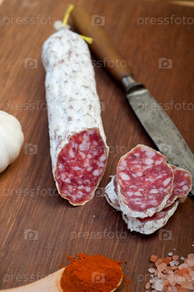 Традиционная итальянская вяленая колбаса салями, нарезанная на деревянной доске