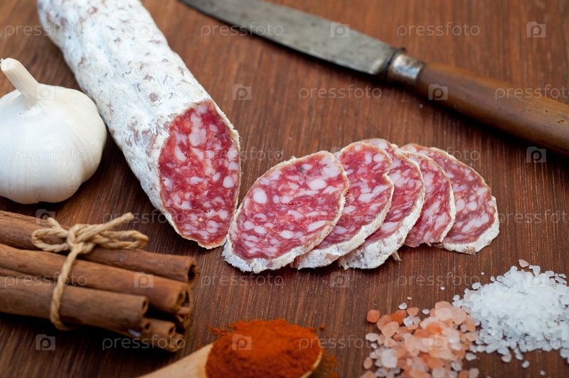 Традиционная итальянская вяленая колбаса салями, нарезанная на деревянной доске