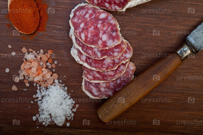 Традиционная итальянская вяленая колбаса салями, нарезанная на деревянной доске