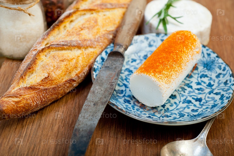Французский сыр и свежий багет на резце по дереву