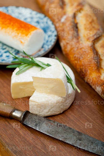 Французский сыр и свежий багет на резце по дереву