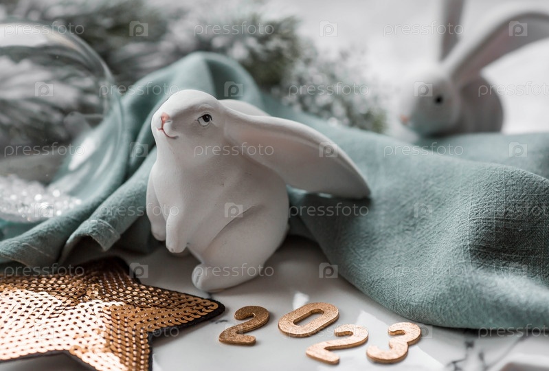 Красивая праздничная открытка. Концепция счастливого нового года и Рождества. Символ года — белый кролик на фоне еловых веток и цифры 2023