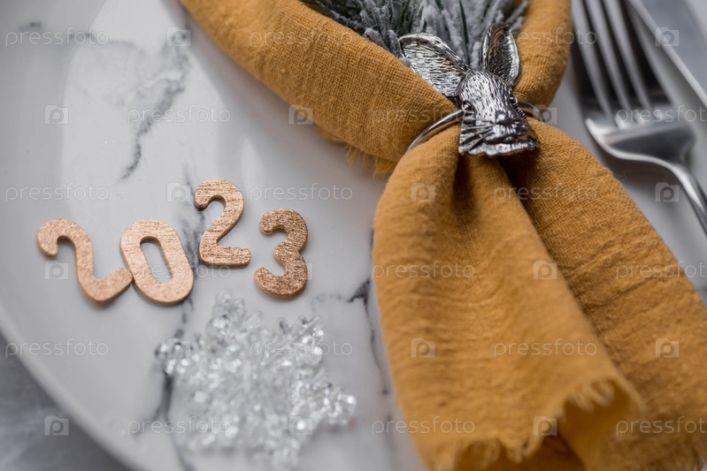 С Новым 2023 годом. Рождественская открытка, баннер с лошадкой-качалкой, елки, подарки и красивое боке на заднем плане. Концепция домашнего зимнего отдыха, тепла и уюта