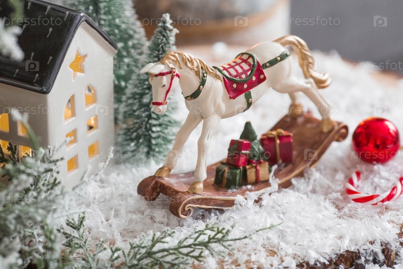 С Новым 2023 годом. Рождественская открытка, баннер с лошадкой-качалкой, елки, подарки и красивое боке на заднем плане. Концепция домашнего зимнего отдыха, тепла и уюта