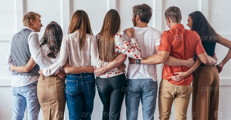 Группа молодых людей, обнимающихся вместе, вид сзади