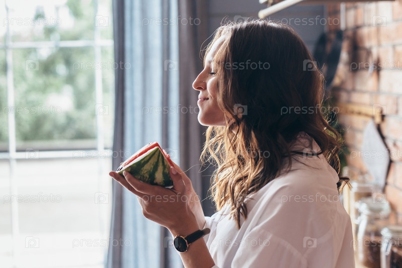 Женщина дома ест арбуз на кухне