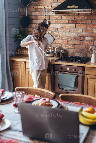 Женщина на кухне у плиты со сковородкой в руках