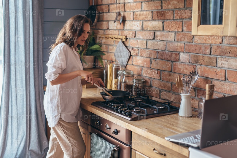 Женщина на кухне у плиты помешивает еду на сковороде