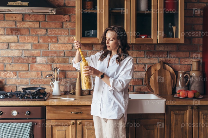 Молодая женщина на кухне берет макароны, чтобы приготовить их