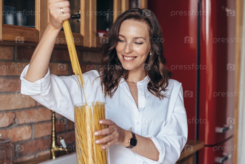 Молодая женщина на кухне с макаронами в руке собирается приготовить еду