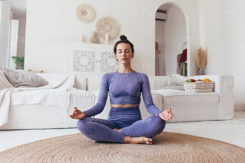 Женщина занимается йогой дома. Подтянутая женщина медитирует в позе лотоса