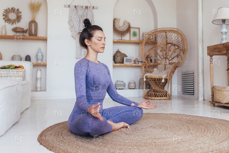 Женщина сидит со скрещенными ногами, положив руки на колени, медитирует, расслабляется во время тренировки йоги